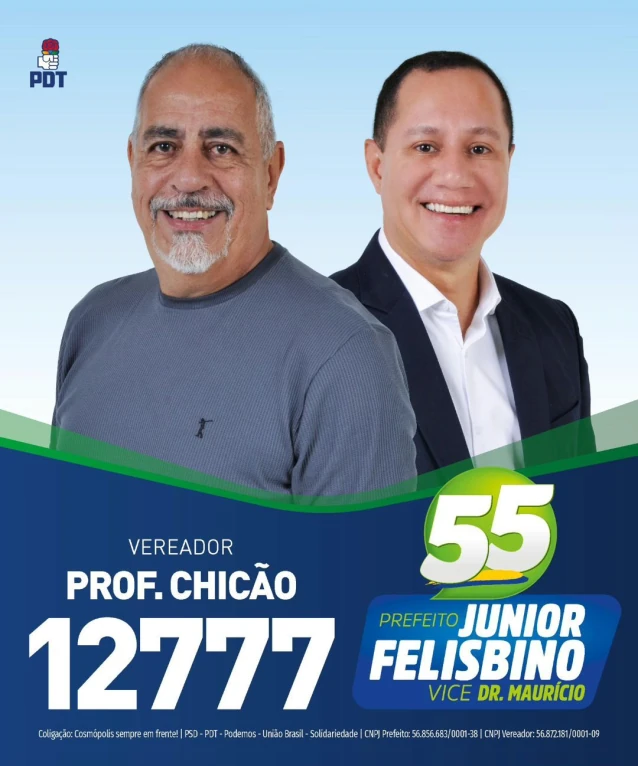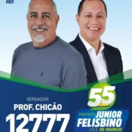 Peço o seu Apoio e o seu Voto para juntos Construir um Futuro Vibrante e Promissor para nossa Cidade. Dia 6 de outubro Vote Professor Chicão –Vereador 12 777, e Júnior Felisbino –Prefeito 55.
